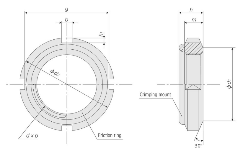 品號 | 螺紋的公稱 (d×p) | 座面直徑 (φd1) | 外徑 (φd2) | 全高 (h) | 螺紋高度 (m) 約 | 槽寬 (b) | 槽深 (h1) 約 | 槽對邊 (g) | 端面 垂直度 (**) | 螺栓余長 ?min | 單重 (g) 約 | |||||||